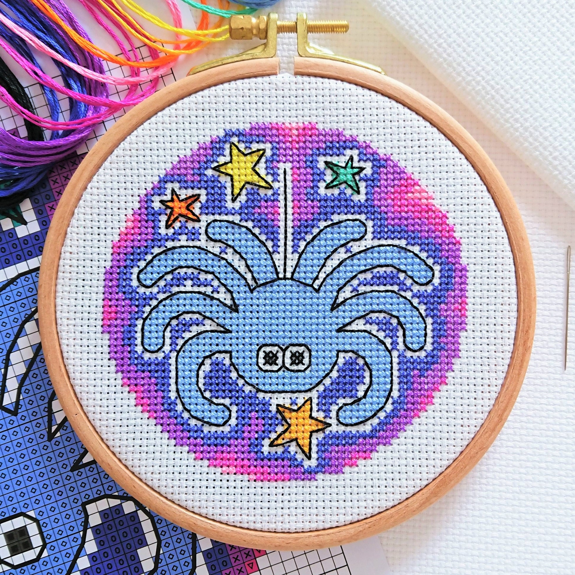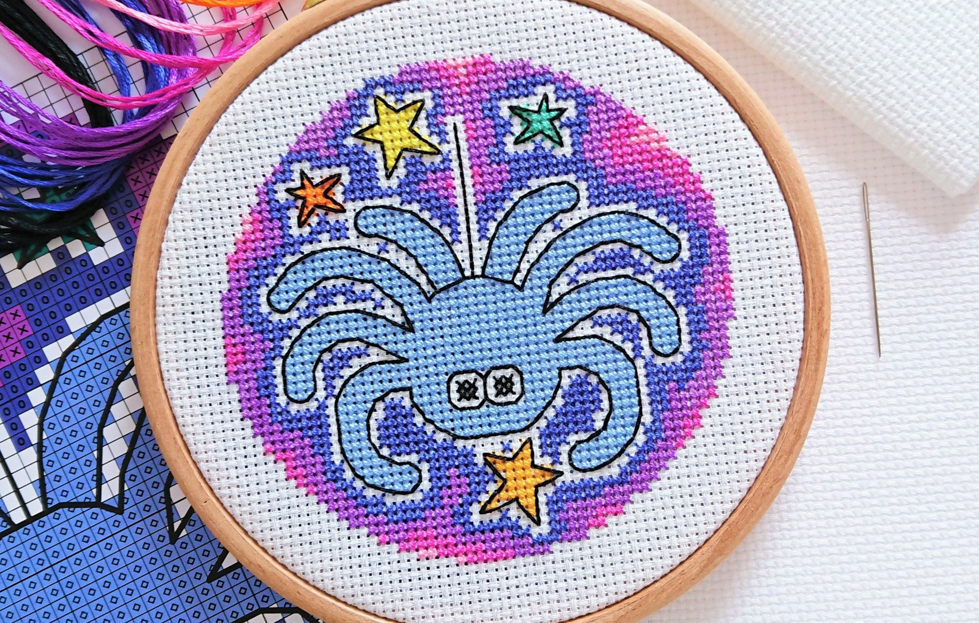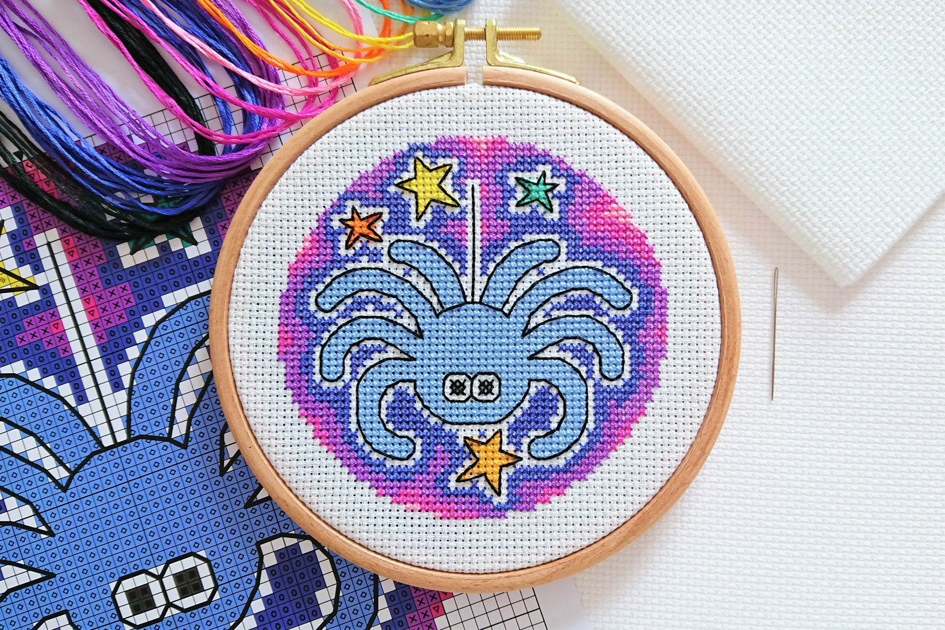 Available here is everything you need to cross stitch this cute little spider for Halloween! The design uses whole cross stitch with backstitch in fun vibrant colours. It is of an easy skill level. It will fit within a 5-inch hoop when stitched.