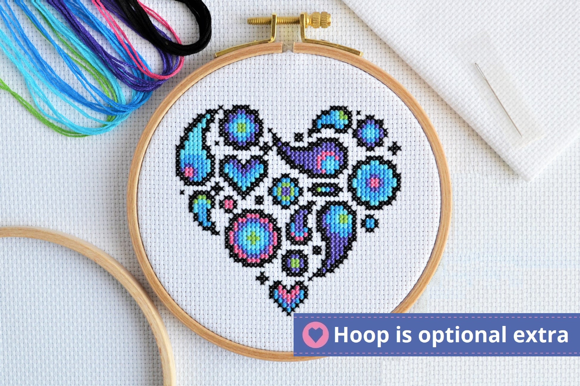 This is an easy skill level cross stitch kit and the design uses whole cross stitches only. When finished it will measure 9.3 cm x 8.5 cm or 3.6 x 3.4 inches. A hoop is not included as standard but you have the option to add a 5-inch Nurge Beechwood hoop as shown in the photos. Happy stitching!