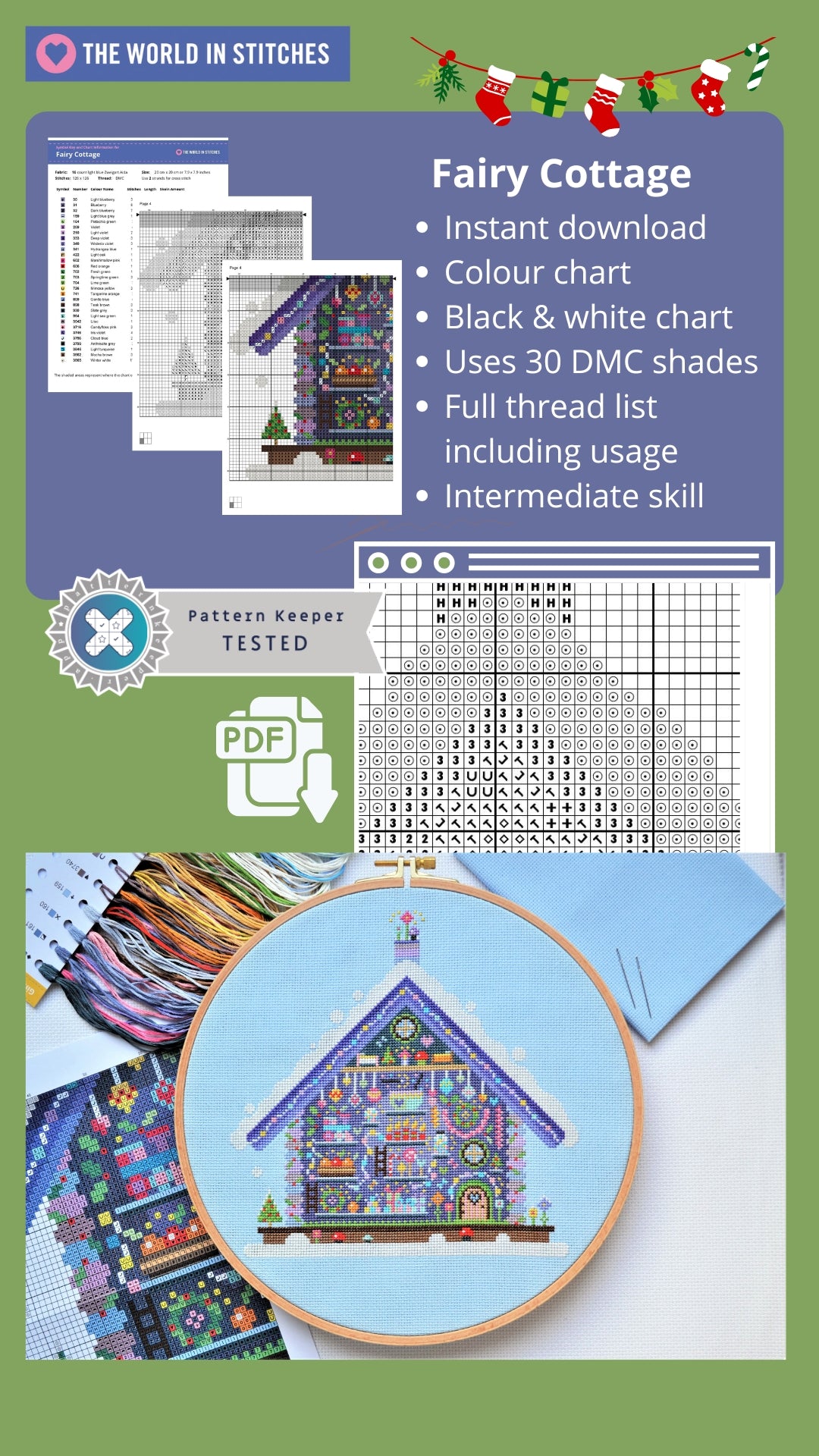 Available here is the complete digital cross stitch chart for this 'Fairy Cottage' which will be made available to you immediately after purchase. You'll be able to download and keep the PDF file.