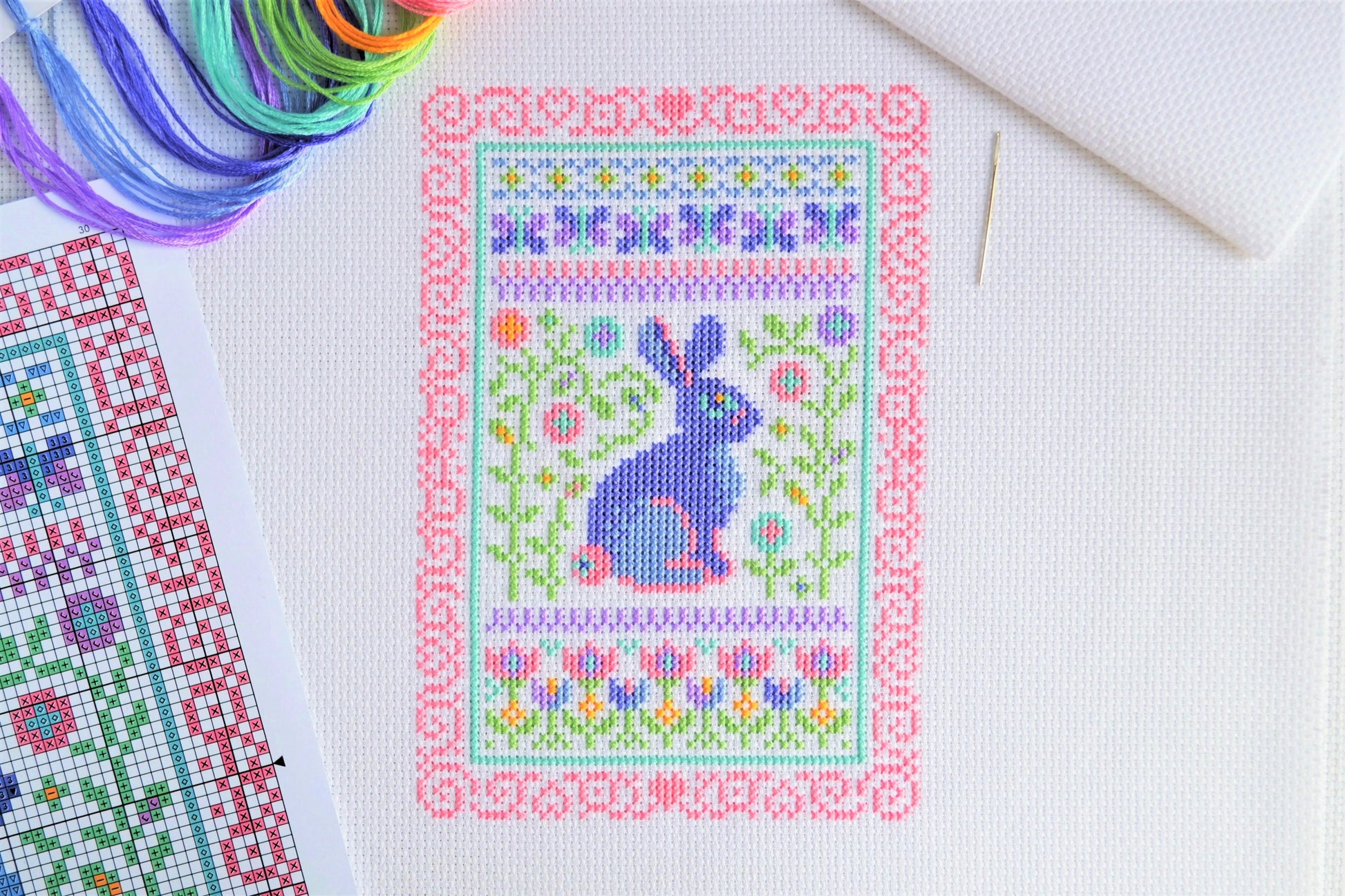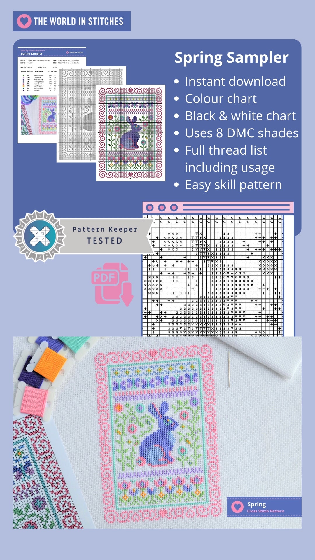 Available here is the complete digital cross stitch chart for this 'Spring Sampler' which will be made available to you immediately after purchase. You'll be able to download and keep the PDF file.