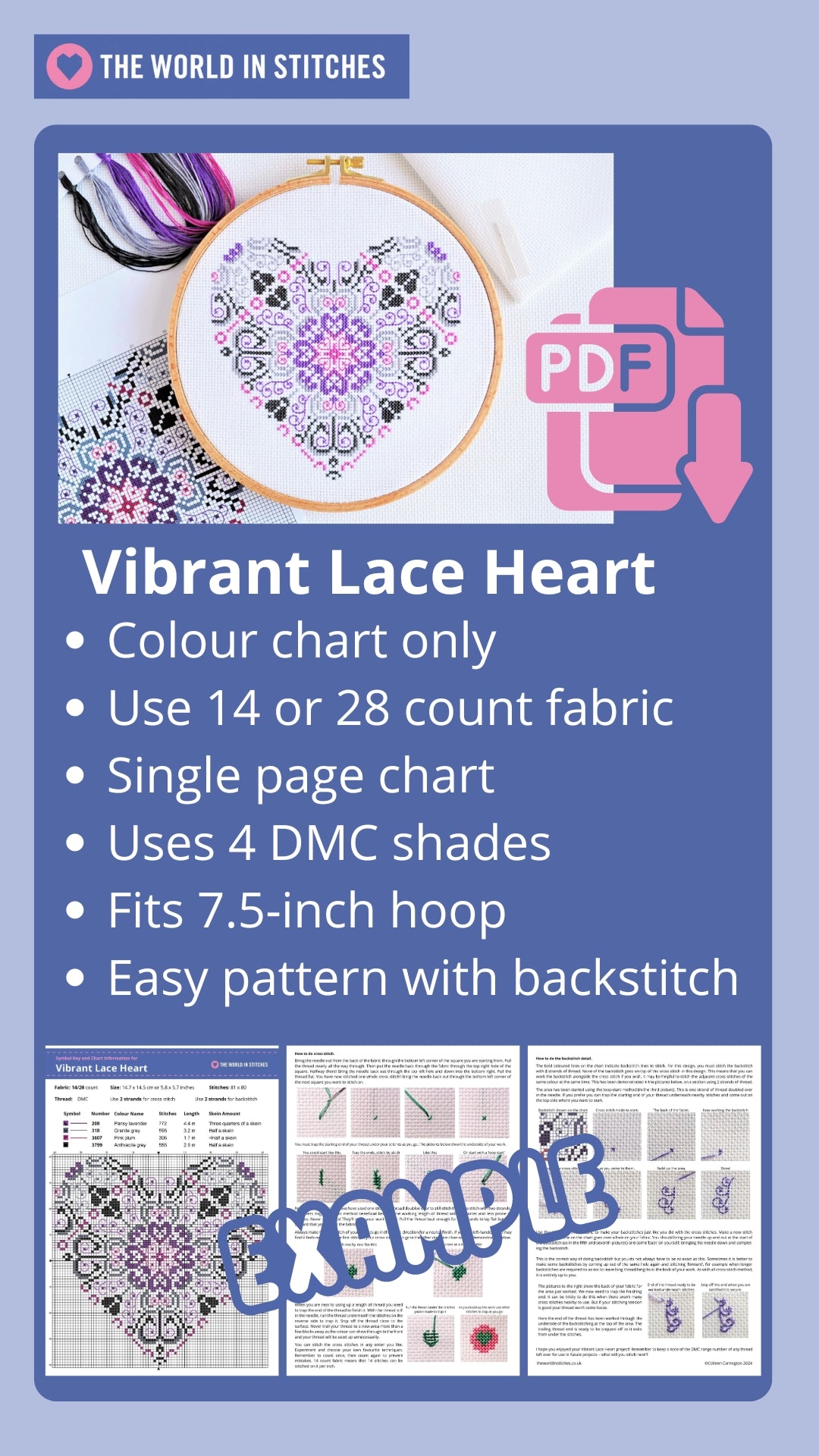 Available here is the complete cross stitch chart for 'Vibrant Lace Heart' which will be made available to you immediately after purchase. You'll be able to download and keep the PDF files.